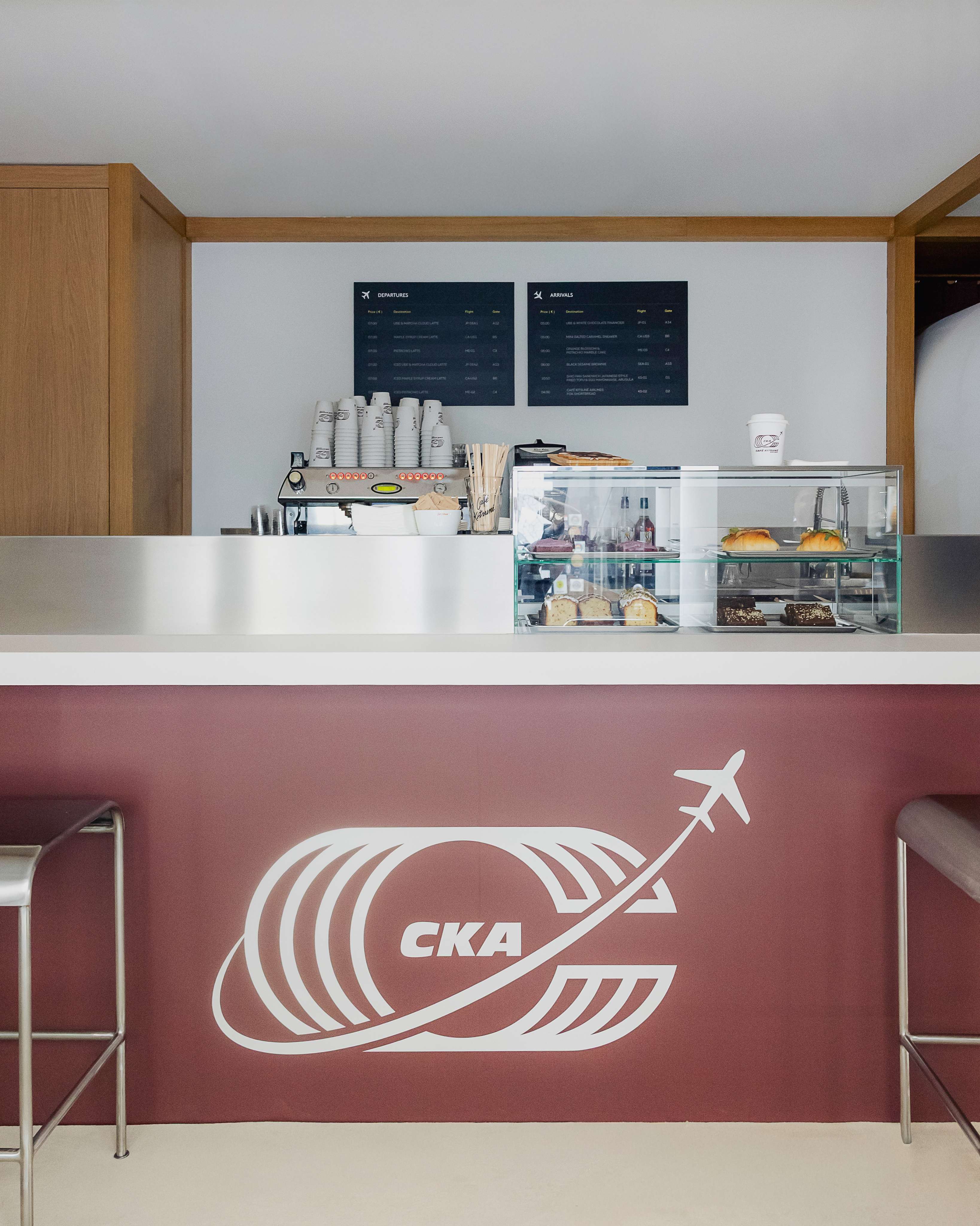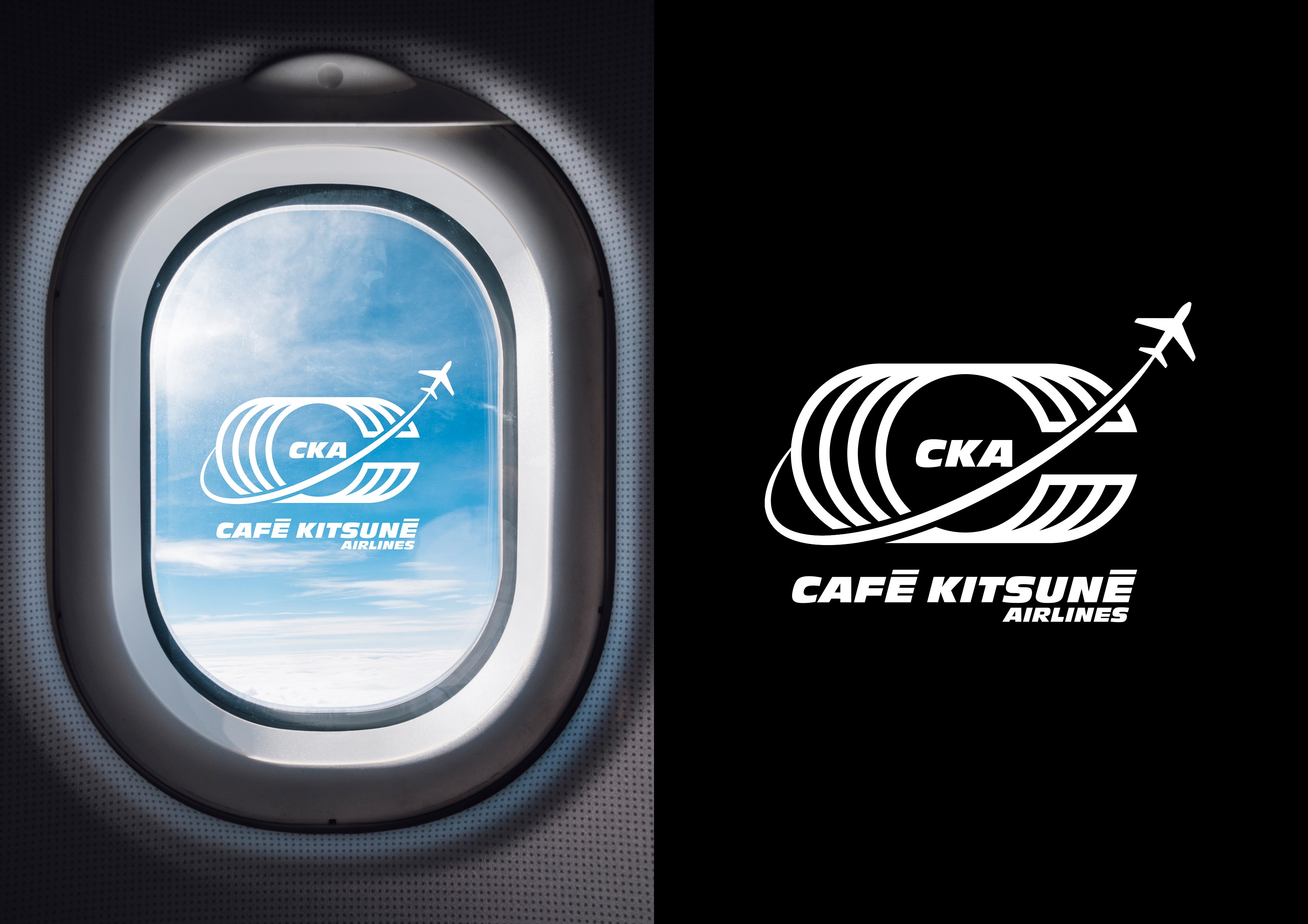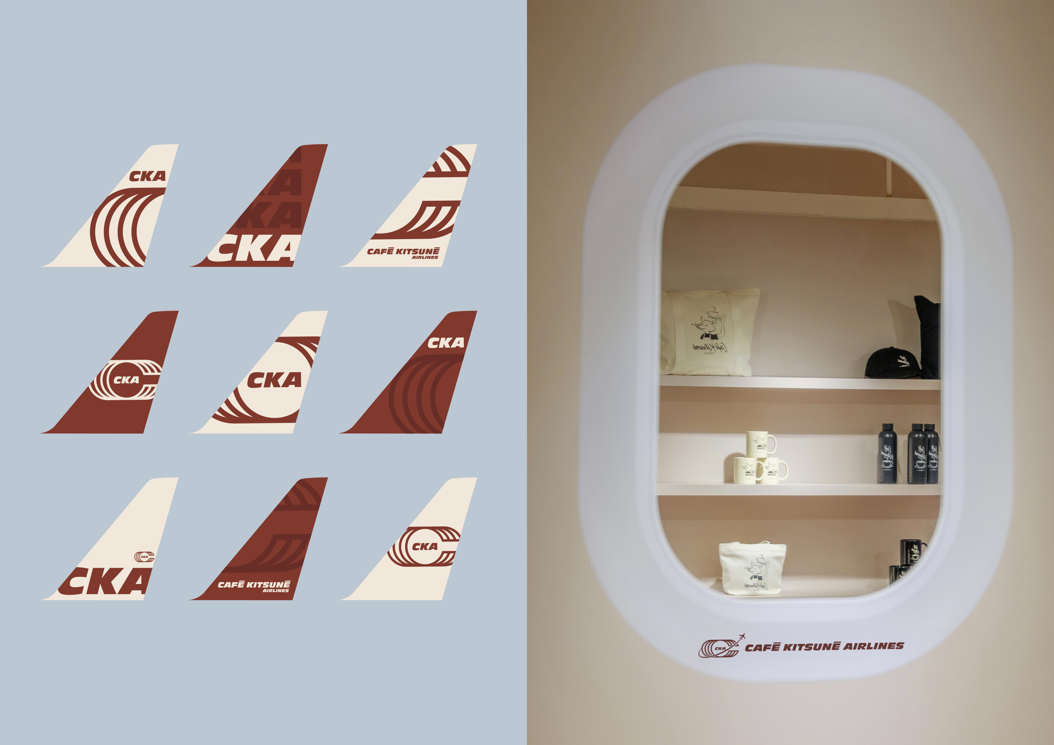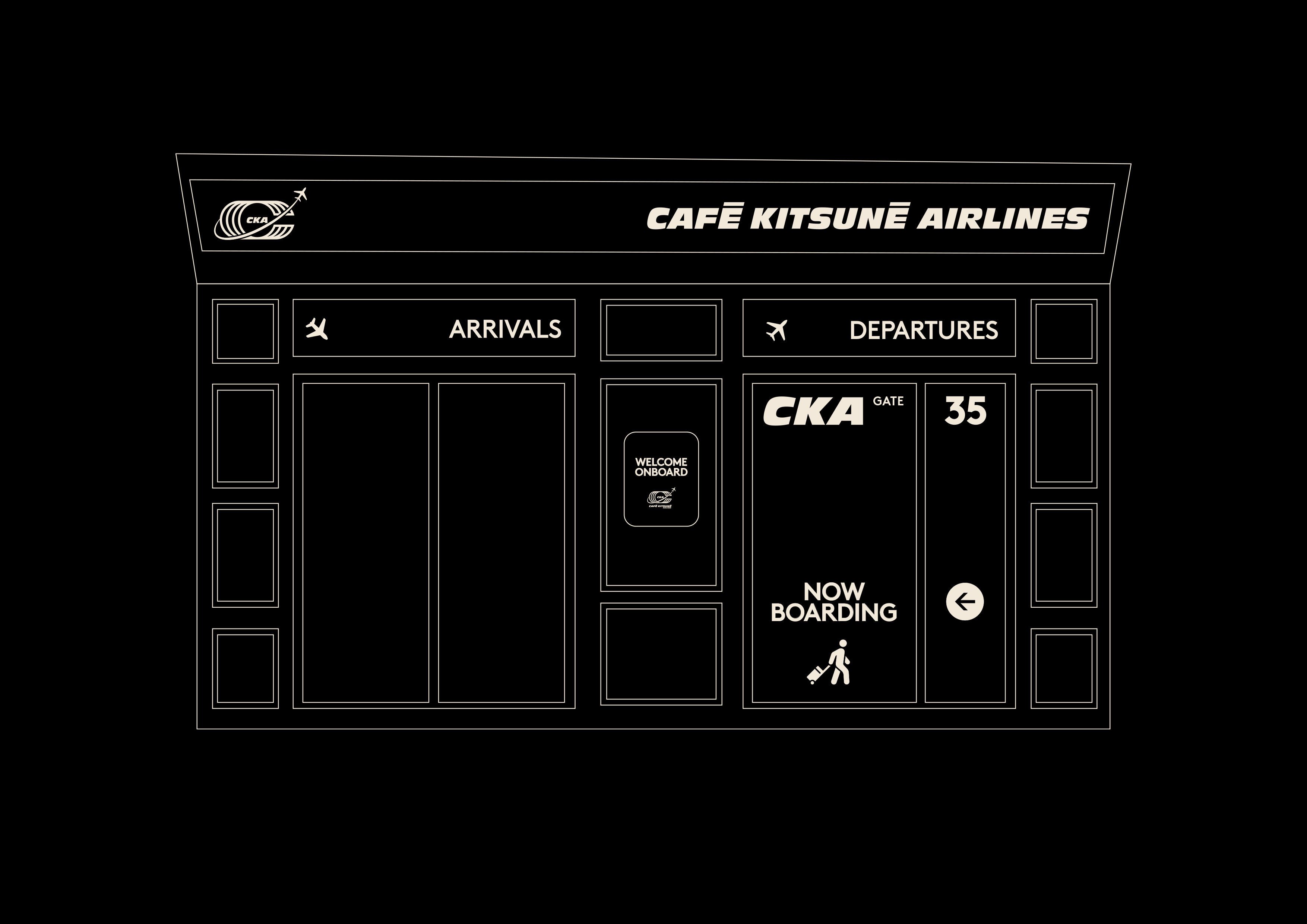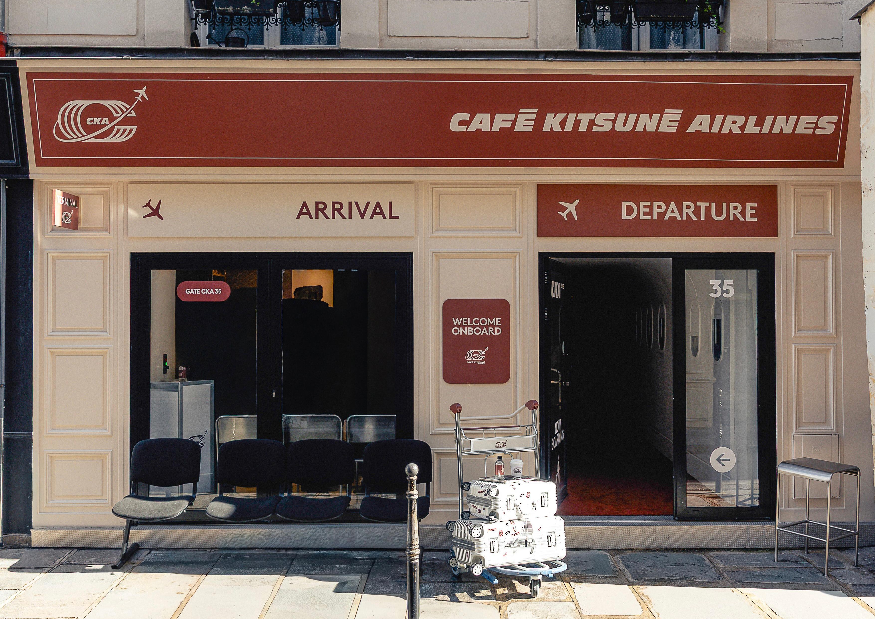 Ce logo s'inscrit dans une expérience immersive totale qui célèbre l'ADN globetrotteur de Café Kitsuné, présent dans 17 pays avec 35 cafés. L'identité visuelle dialogue avec une scénographie complète : coque d'avion intégrée au café, écrans digitaux, façade de terminal, panneaux d'affichage, chariots à bagages et mobilier inspiré des lounges d'aéroport.