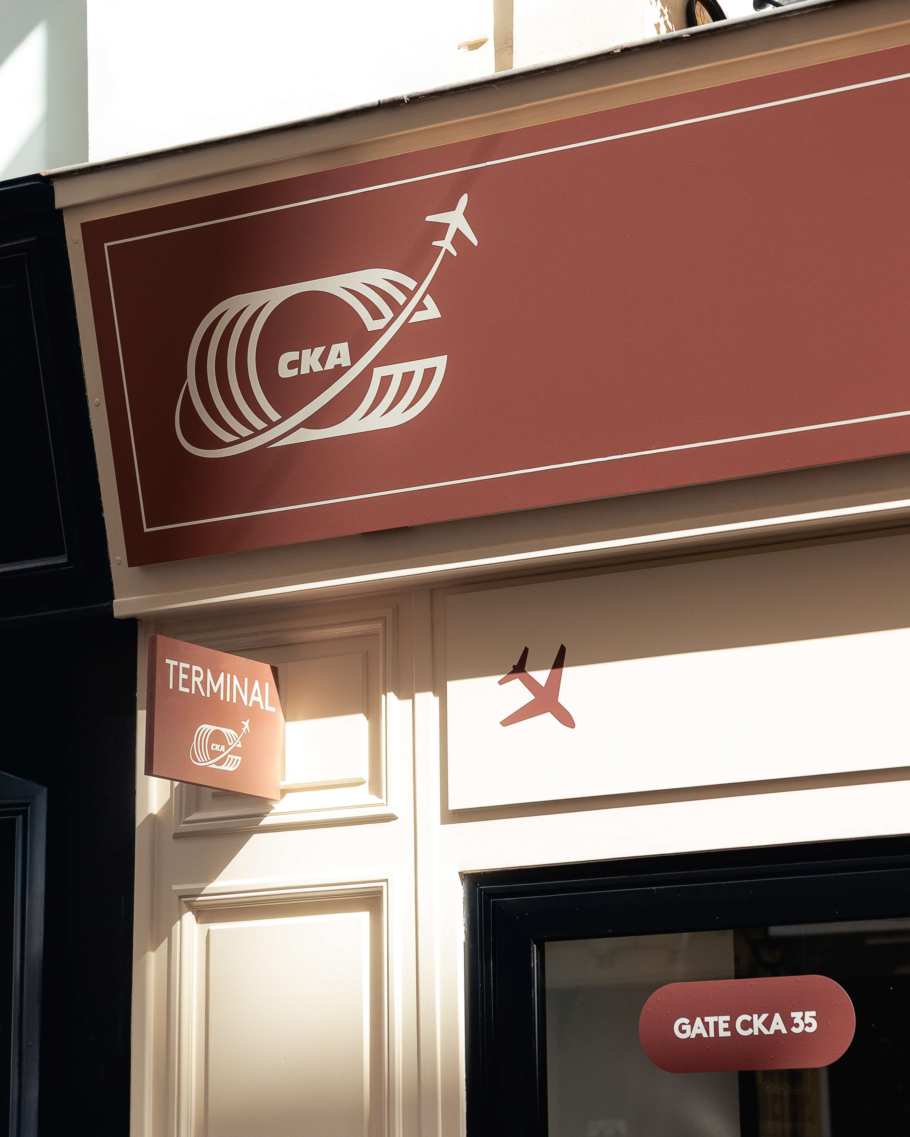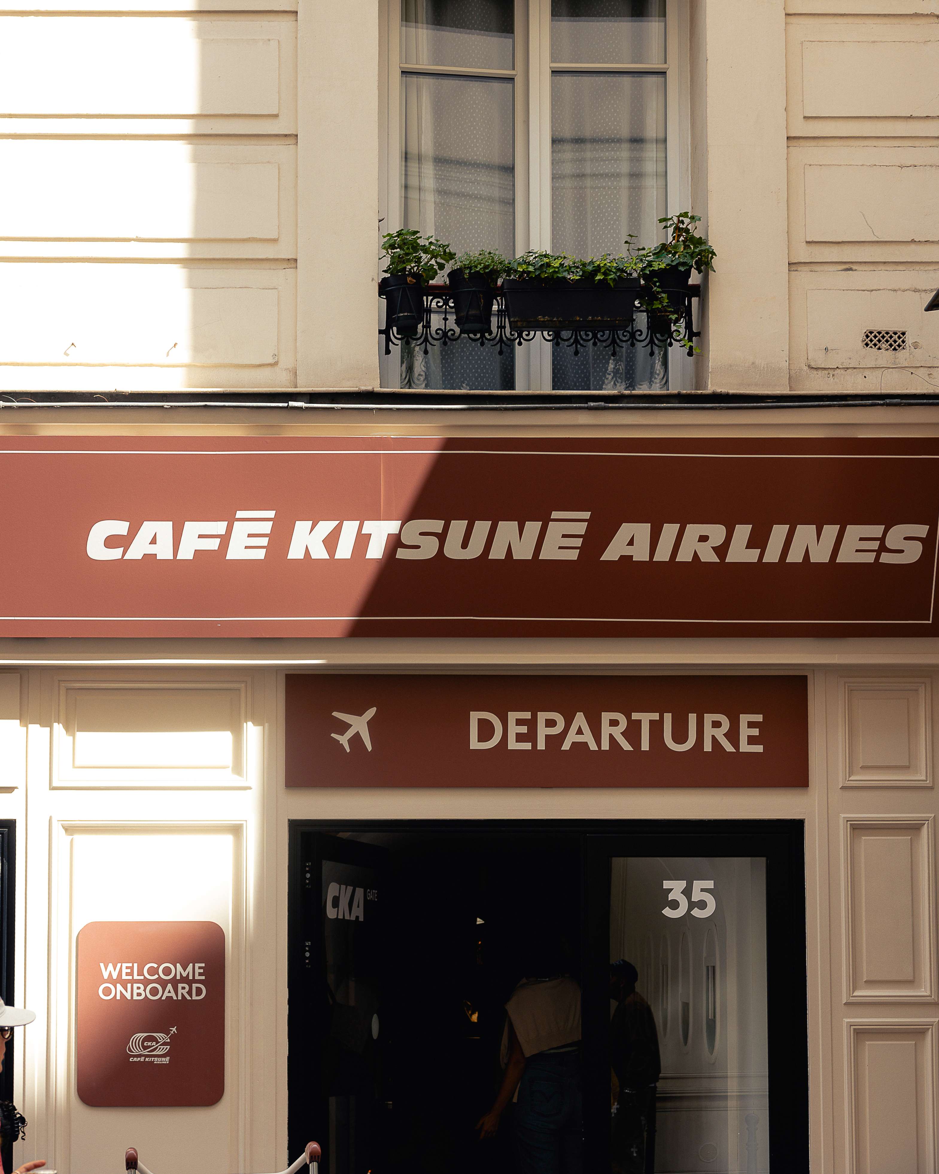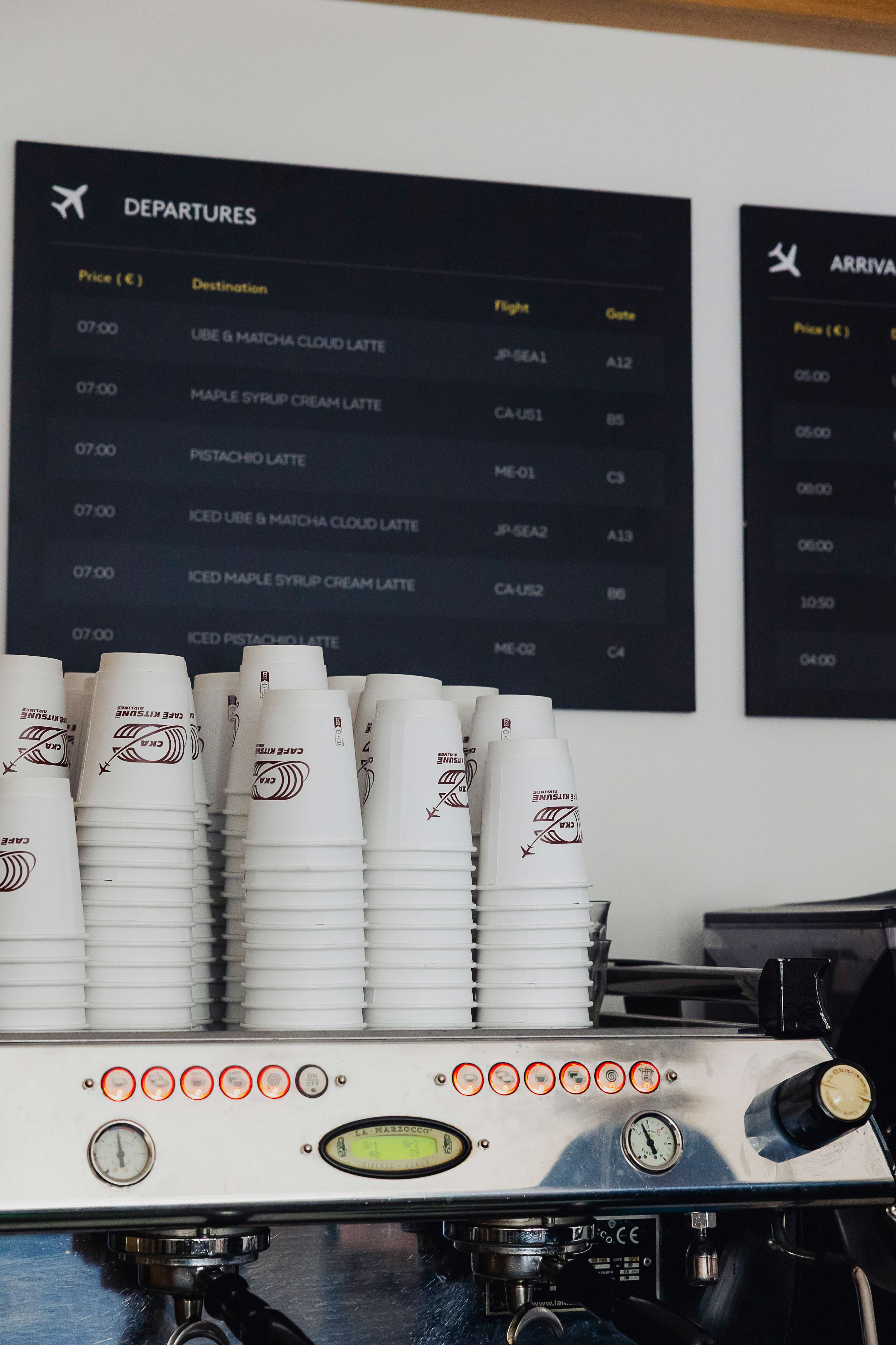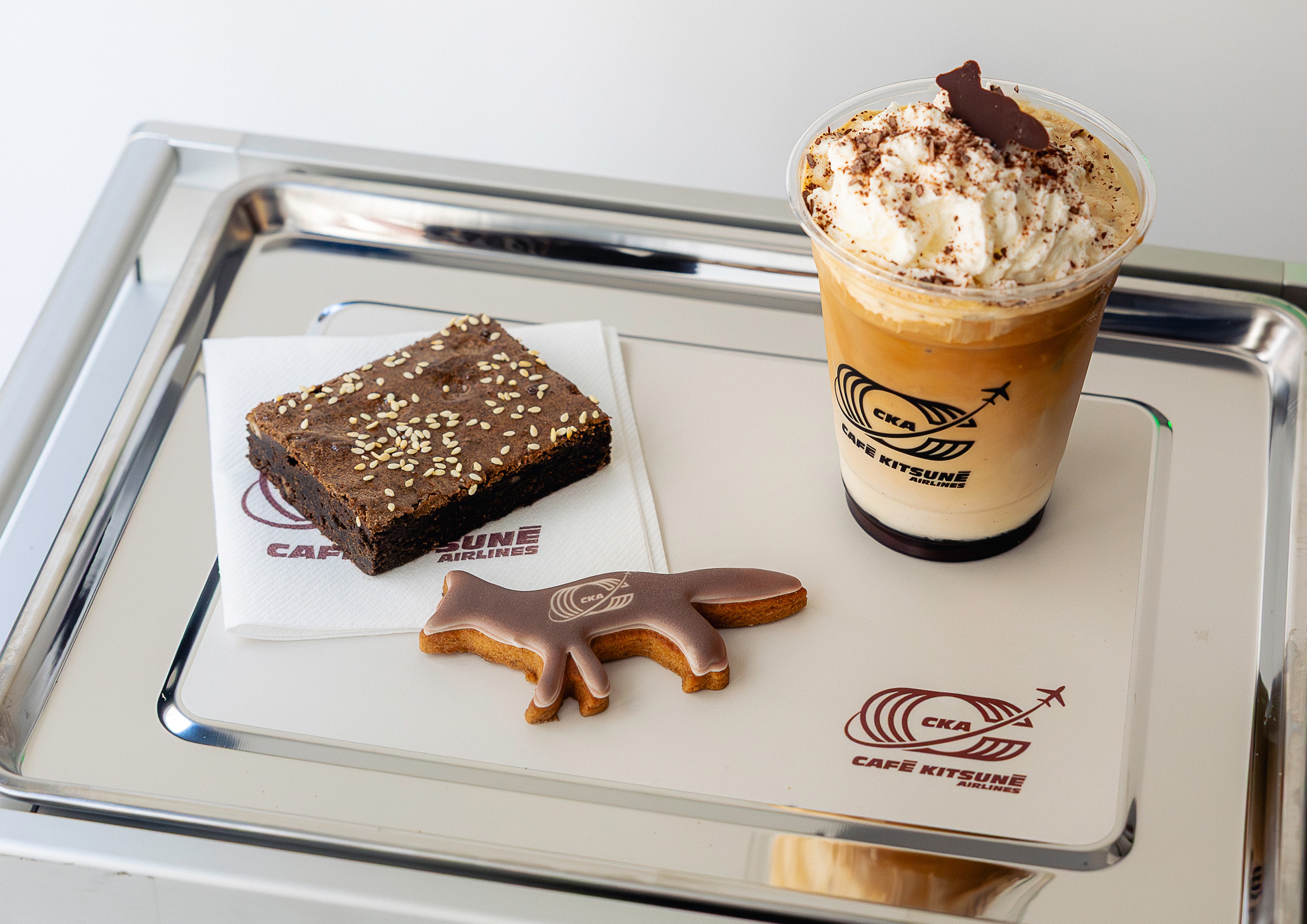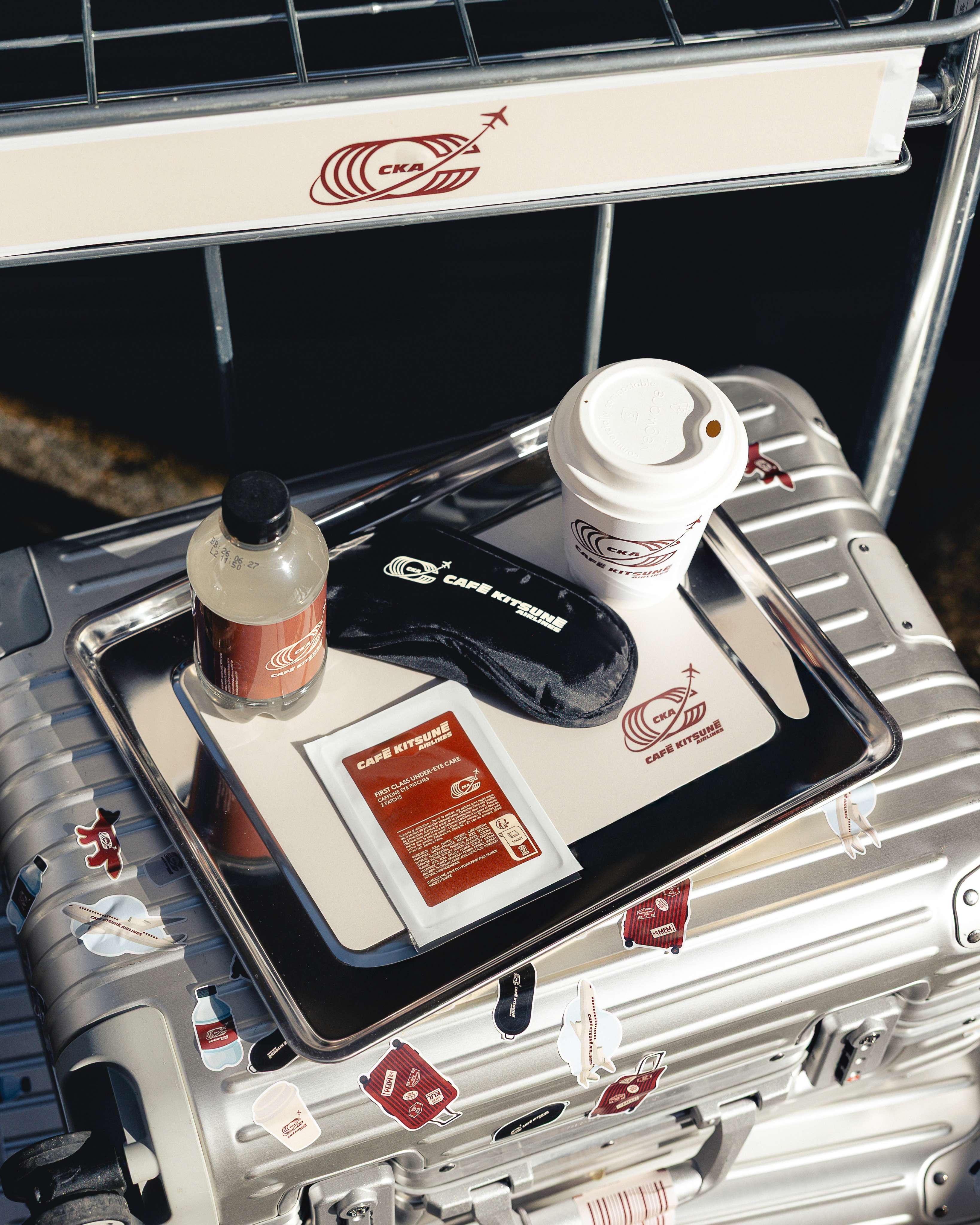 Ce logo s'inscrit dans une expérience immersive totale qui célèbre l'ADN globetrotteur de Café Kitsuné, présent dans 17 pays avec 35 cafés. L'identité visuelle dialogue avec une scénographie complète : coque d'avion intégrée au café, écrans digitaux, façade de terminal, panneaux d'affichage, chariots à bagages et mobilier inspiré des lounges d'aéroport.