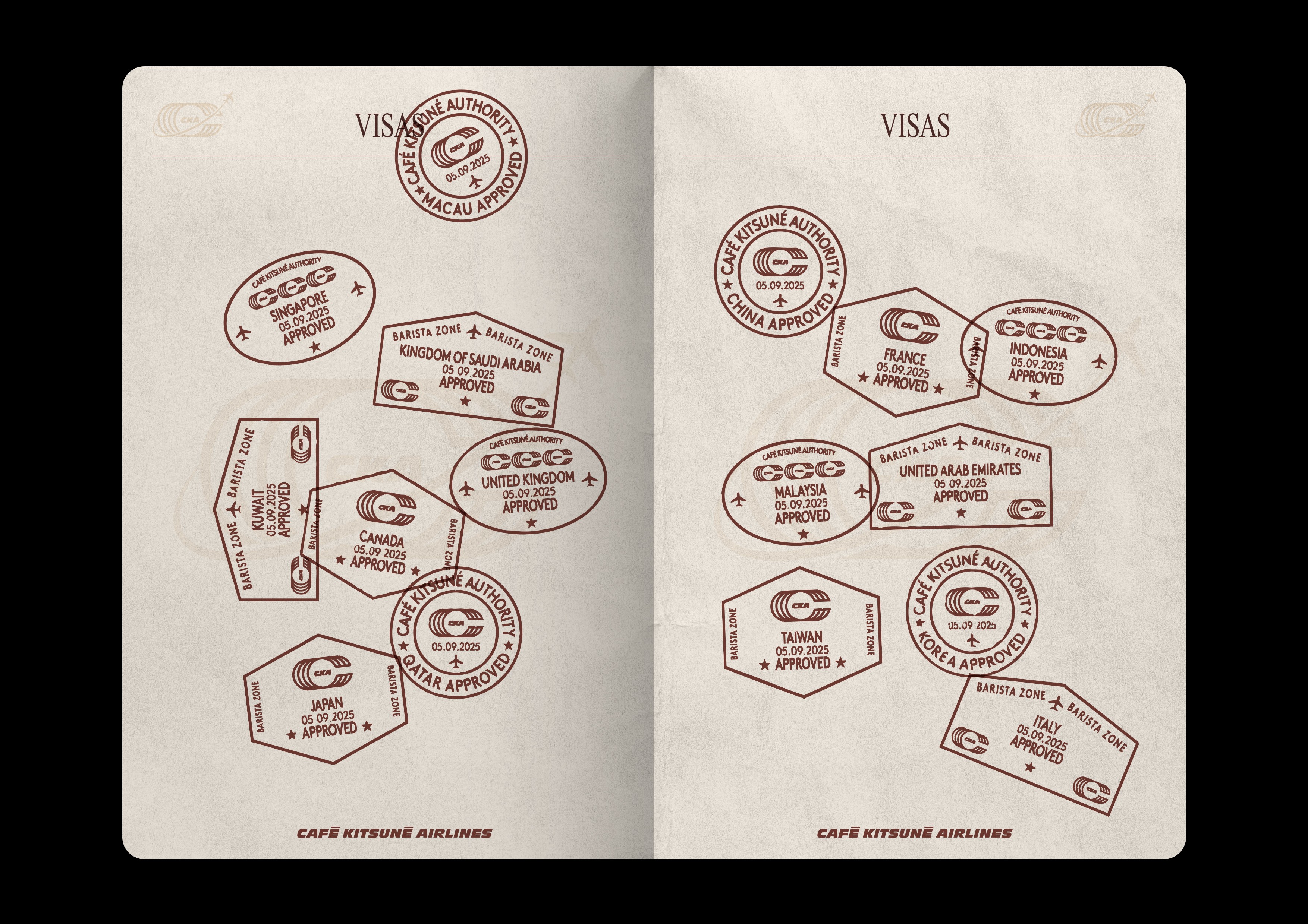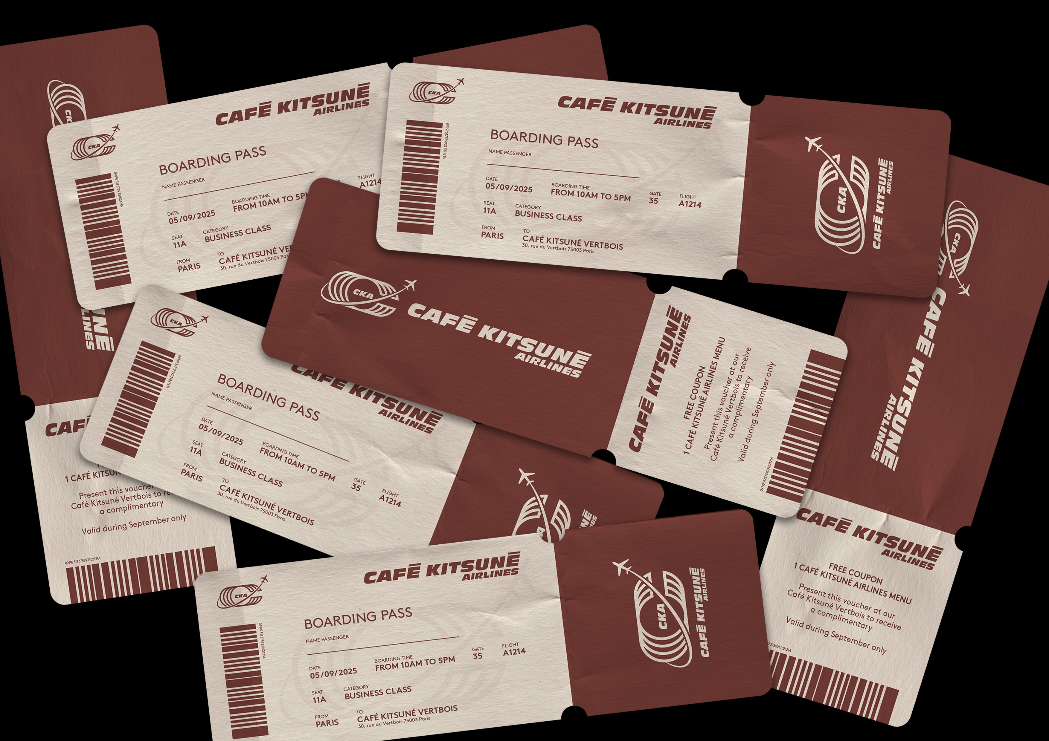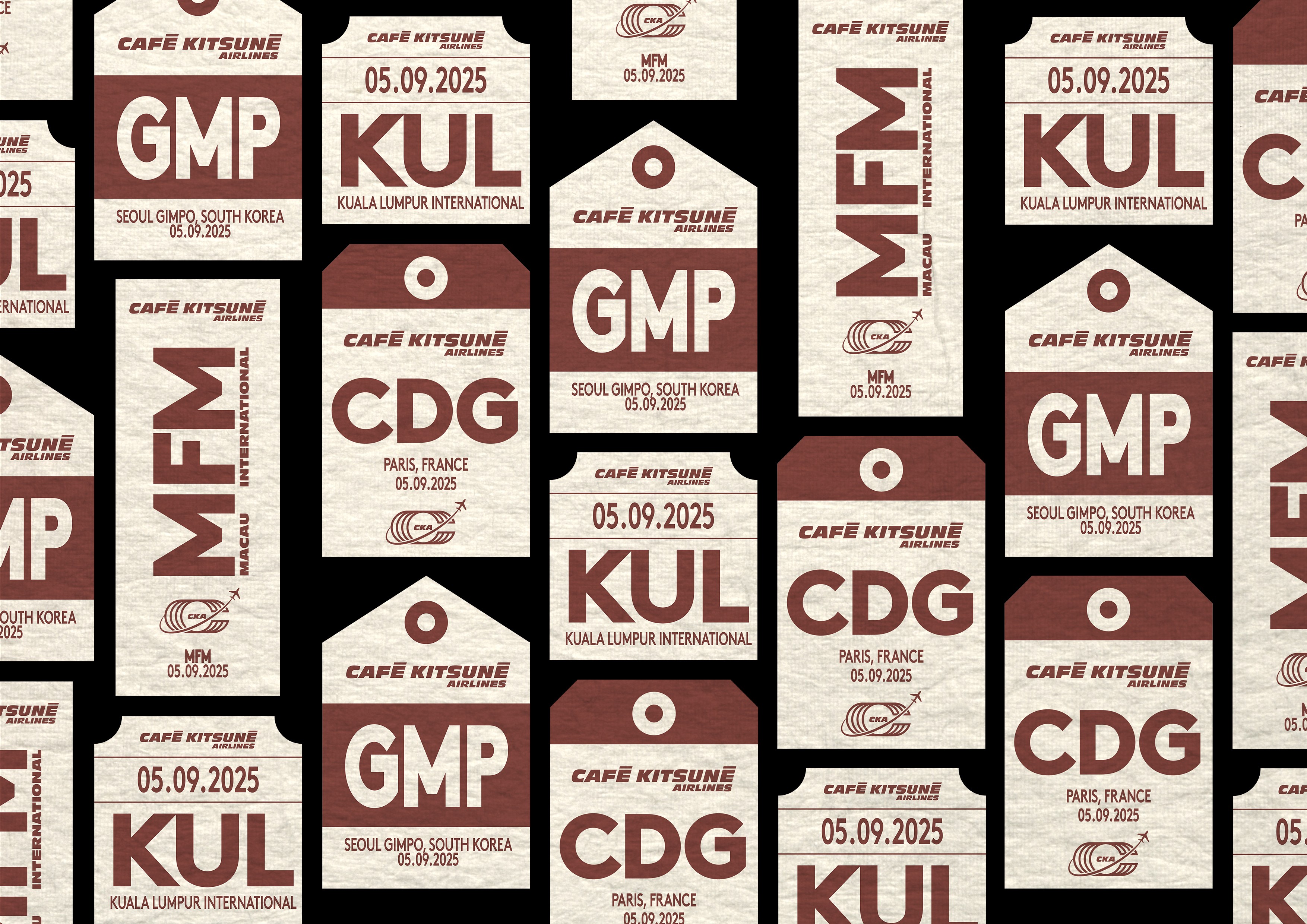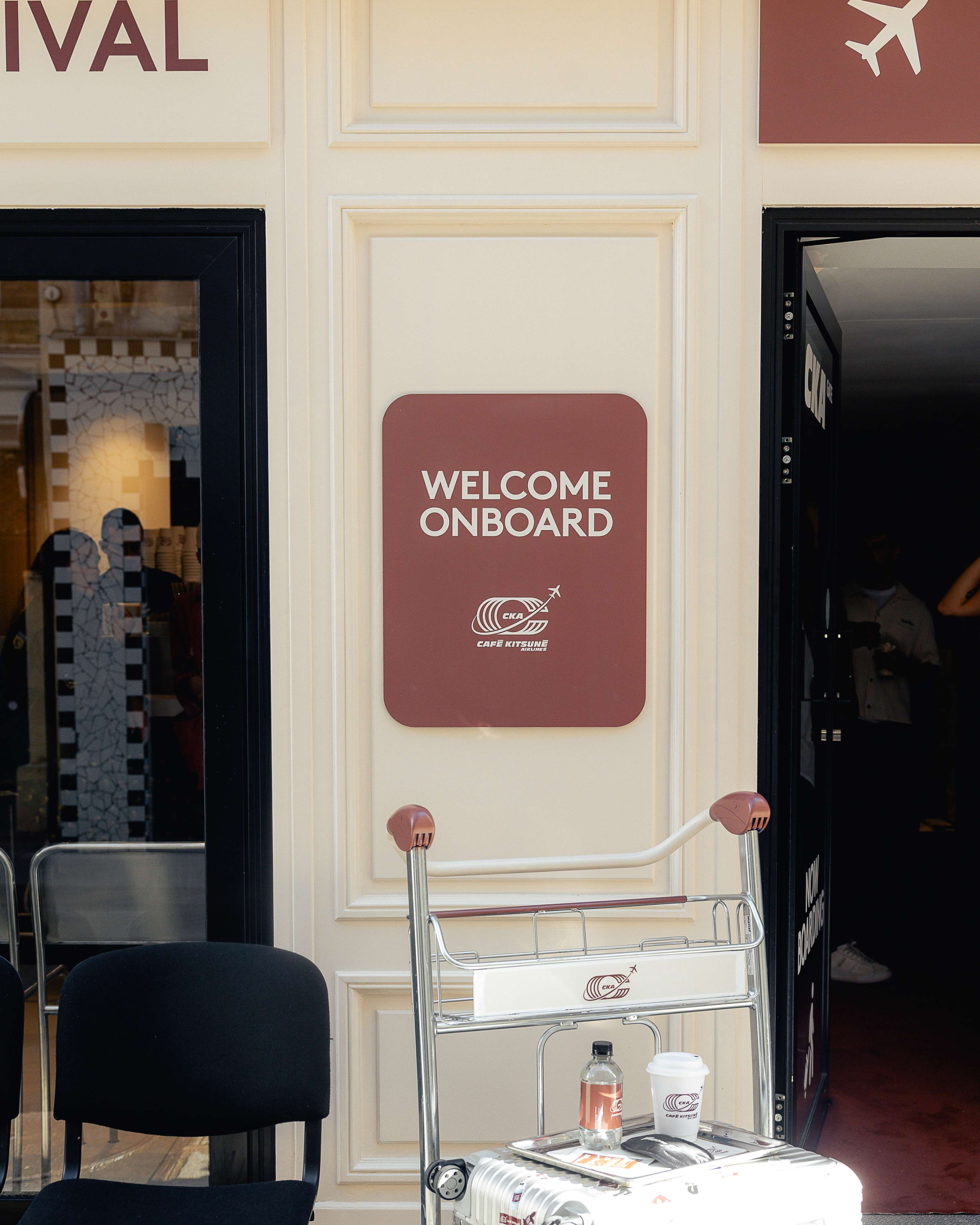 Dans le cadre d'un pop-up store éphémère, nous avons été chargé de concevoir l'identité visuelle événementielle pour Café Kitsuné Airlines, une compagnie aérienne fictive imaginée pour transformer l'adresse parisienne du Marais à Paris en véritable terminal d'embarquement.